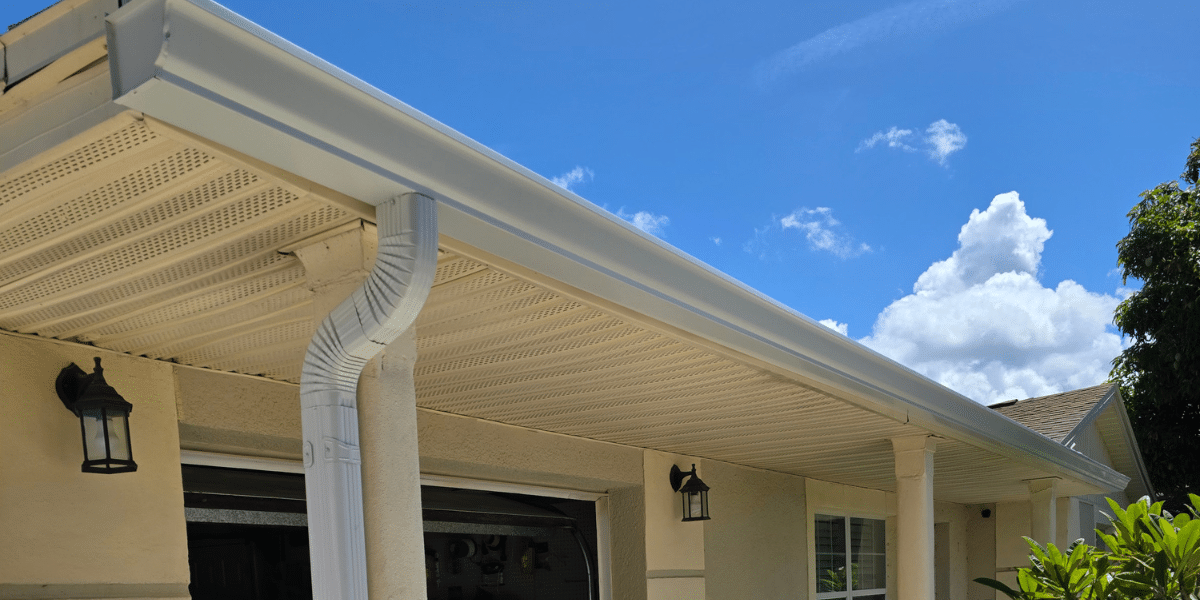 This Holiday home received a complete front gutter system upgrade featuring our premium seamless gutters paired with high-performance leaf guards. The new installation provides superior water management while preventing debris buildup that can cause clogs and damage. Our team custom-fabricated the seamless gutters on-site to ensure perfect measurements and a clean, attractive appearance that complements the home’s exterior. The strategically placed downspouts direct water away from the foundation, protecting the property from potential water damage. The added leaf guards feature our small-hole design that effectively deflects leaves, pine needles and other debris while handling heavy Florida rainfall with ease. This comprehensive gutter solution offers the homeowner peace of mind with our standard 2-year warranty on both product and installation.